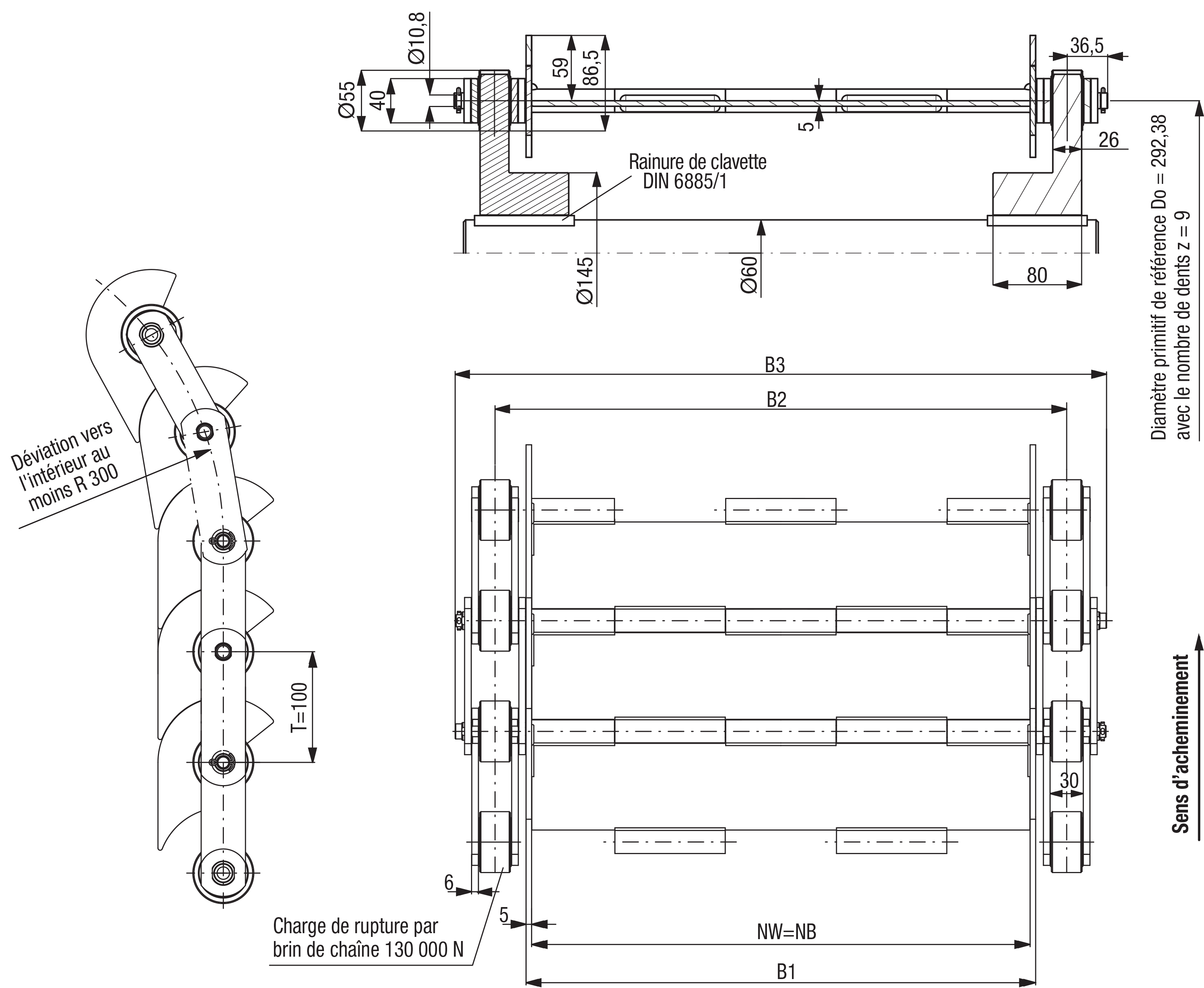 | NW mm Nominal width | NB mm Working width | B1 mm Outside width | B2 mm Centre distance of chain | B3 mm Total width | Weight kg/meter |