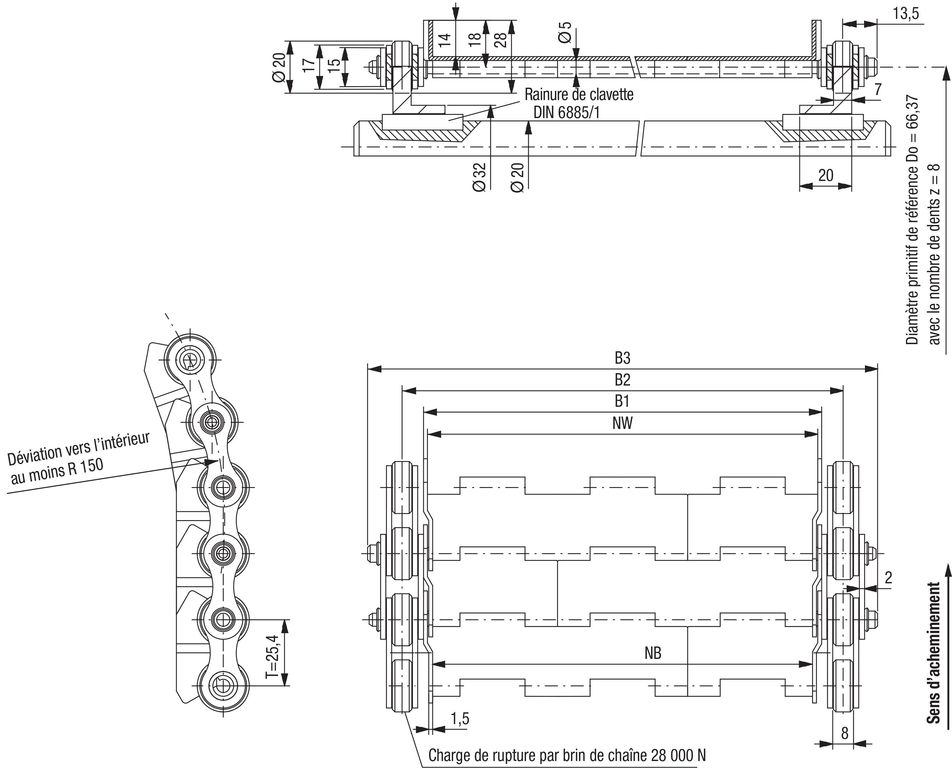 | NW mm Nominal width | NB mm Wording width | B1 mm Outside width | B2 mm Centre distance of chains | B3 mm Total width | Weight kg/meter |