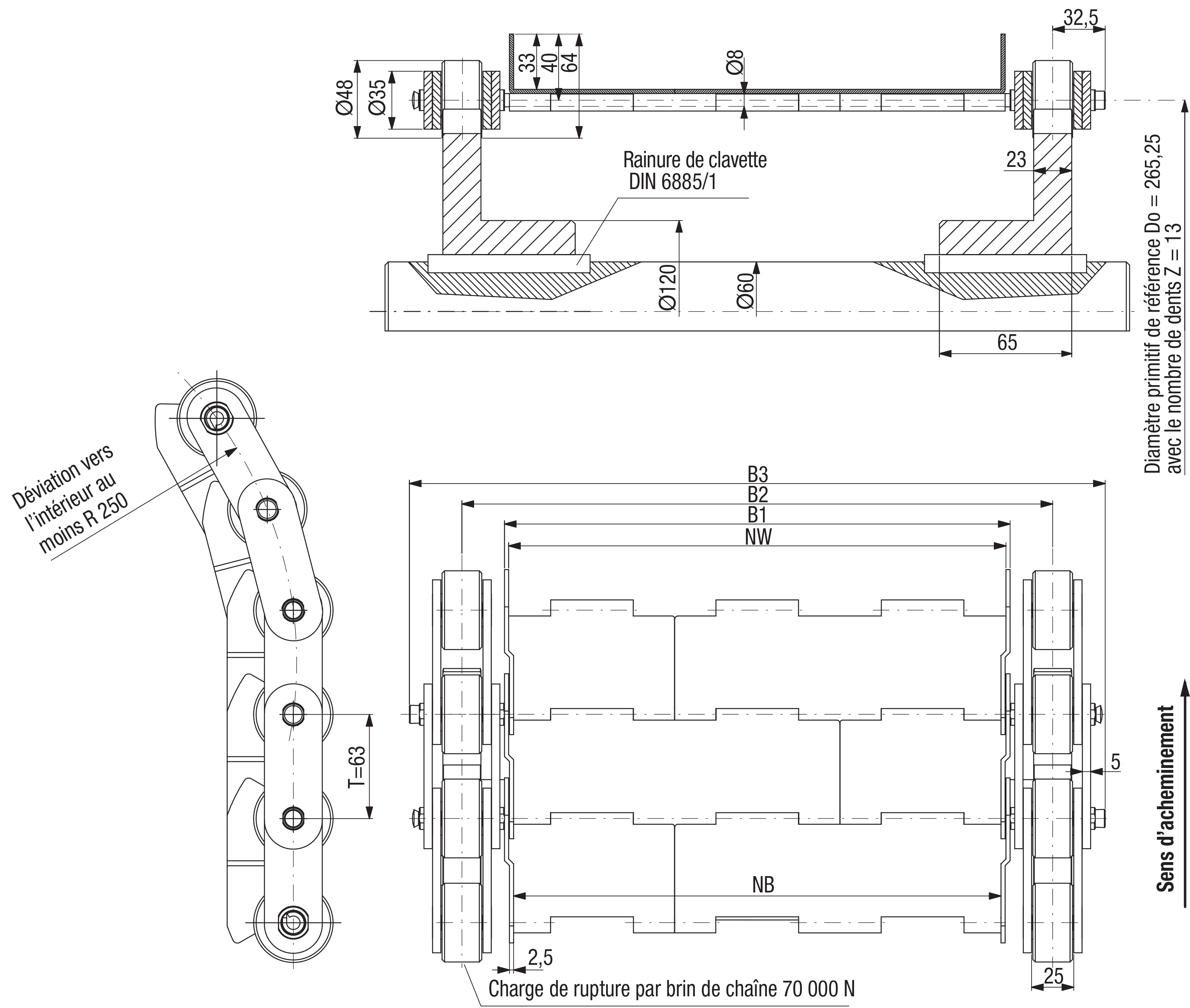 | NW mm Nominal width | NB mm Working width | B1 mm Outside width | B2 mm Centre distance of chain | B3 mm Total width | Weight kg/meter |